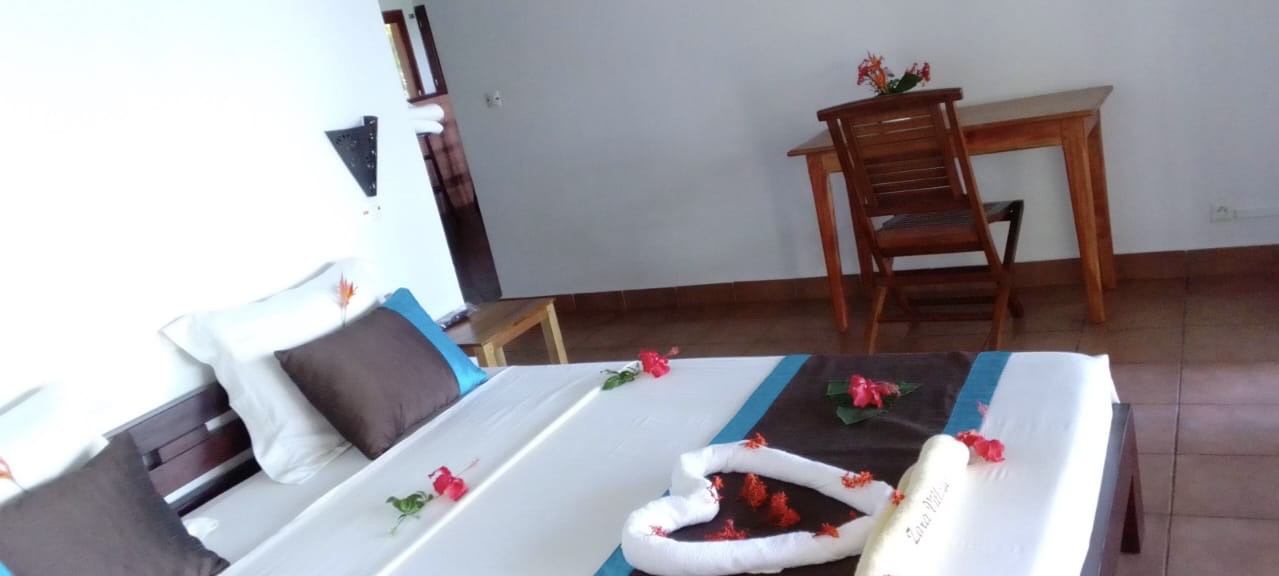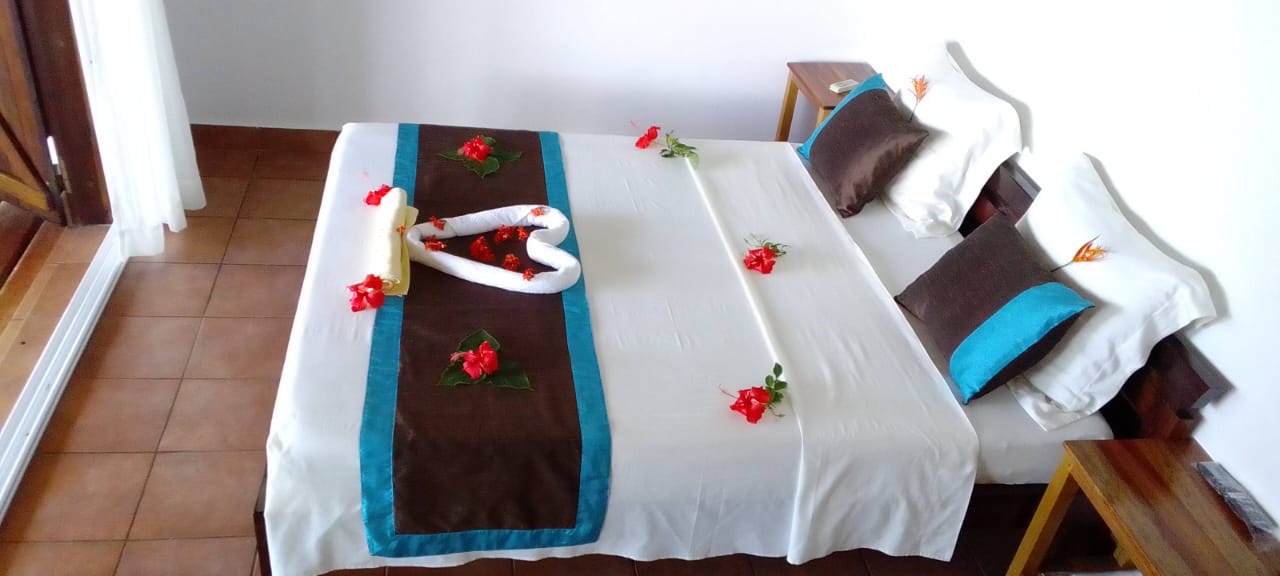 Chambres spacieuses et confortables: Détendez-vous dans un espace chaleureux et élégant, doté de tout le confort nécessaire pour un séjour paisible. Nos deux chambres doubles vue mer avec un lit queen size, ventilées, équipée d'un étagère de rangement, une table de bureau, TV satellite, une salle d'eau, eau chaude. Une grande terrasse.